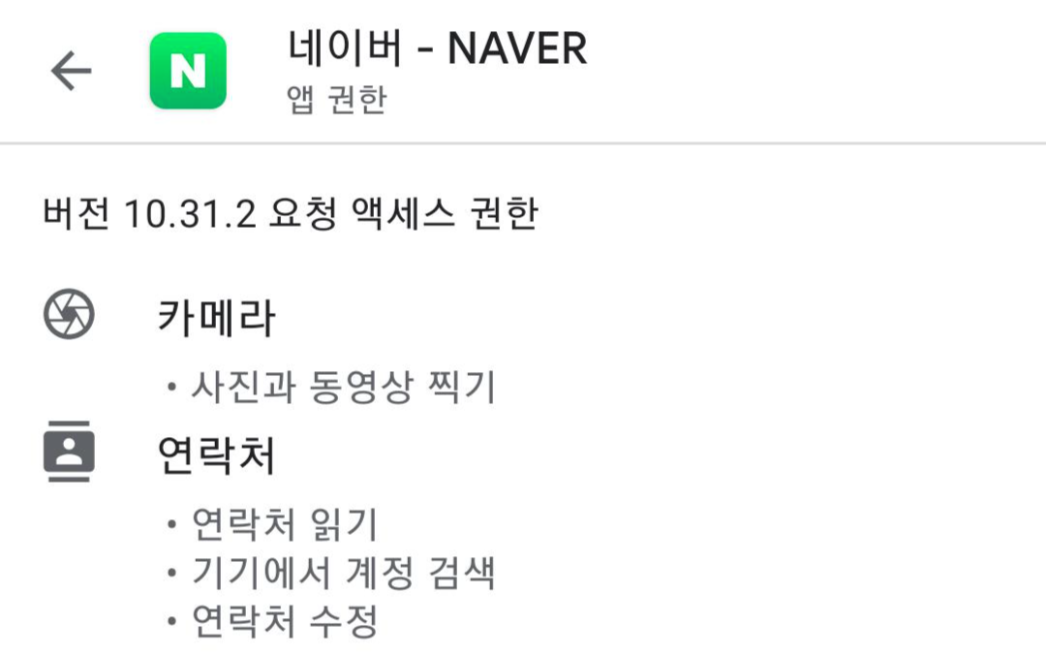 PlayStore에서 앱 검색 후 앱 권한 확인 시, 다음과 같은 화면을 볼 수 있다. 아래는 네이버 앱의 요청 권한 중 일부를 캡쳐한 것이다.